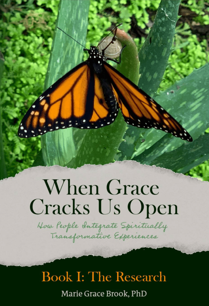 “Spiritually transformative experiences are often not shared with professional clinicians for fear of being misunderstood. Despite growing research, most clinicians feel unprepared to work with experiencers and with the immense changes and challenges they face. When Grace Cracks Us Open, Book 1: The Research fills the need for evidence-based information about such experiences, based on Marie Grace Brook’s research and her lifetime of professional experience in clinical mental health and academia. Readers will find in its pages helpful conclusions and practical techniques to support experiencers in their psychospiritual struggles.”